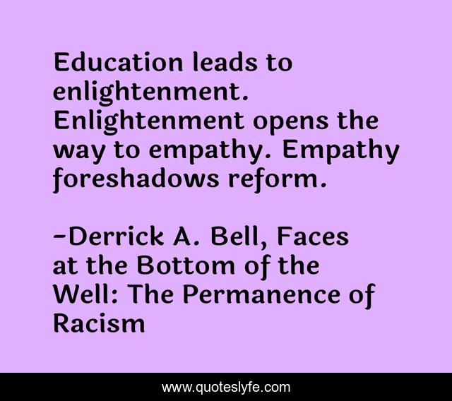 This page presents the quote "Education leads to enlightenment. Enlightenment opens the way to empathy. Empathy foreshadows reform.". Author of this quote is Derrick A. Bell, Faces at the Bottom of the Well: The Permanence of Racism. This quote is about justice, enlightenment, education, empathy, reform,.