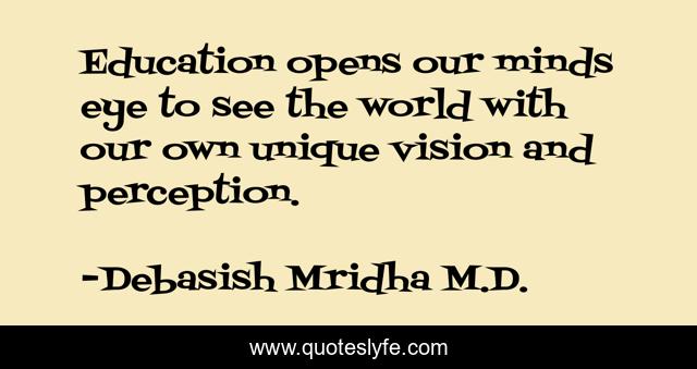 This page presents the quote "Education opens our minds eye to see the world with our own unique vision and perception.". Author of this quote is Debasish Mridha M.D.. This quote is about perception, mridha, debasish, quotes, see-the-world, inspirational, enthusiasm, education, debasish-mridha-m-d,.