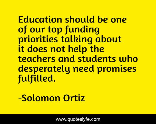 This page presents the quote "Education should be one of our top funding priorities talking about it does not help the teachers and students who desperately need promises fulfilled.". Author of this quote is Solomon Ortiz. This quote is about students, help, priorities,.