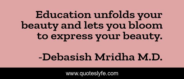 This page presents the quote "Education unfolds your beauty and lets you bloom to express your beauty.". Author of this quote is Debasish Mridha M.D.. This quote is about lets-you-bloom, express-your-beauty, beauty, philosophy, debasish-mridha, quotes, inspirational, enthusiasm, education,.
