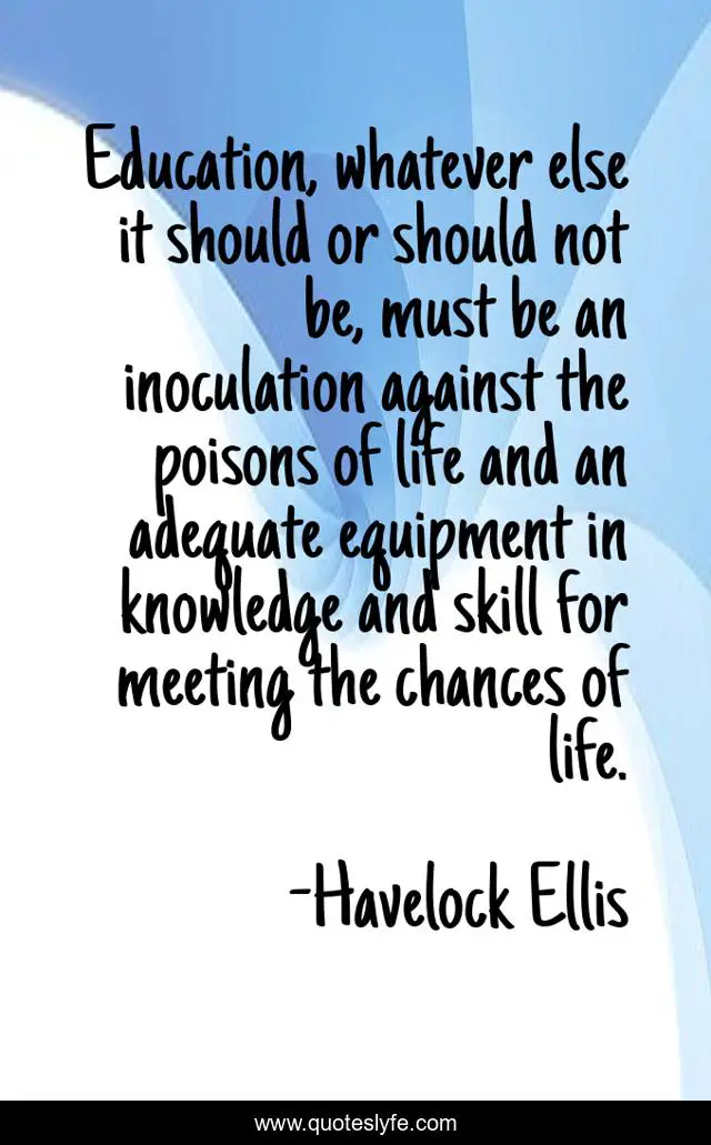 This page presents the quote "Education, whatever else it should or should not be, must be an inoculation against the poisons of life and an adequate equipment in knowledge and skill for meeting the chances of life.". Author of this quote is Havelock Ellis. This quote is about life, meeting, knowledge,.