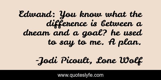 This page presents the quote "Edward: You know what the difference is between a dream and a goal? he used to say to me. A plan.". Author of this quote is Jodi Picoult, Lone Wolf. This quote is about jodi-picoult, lone-wolf, goals, dreams, plans,.