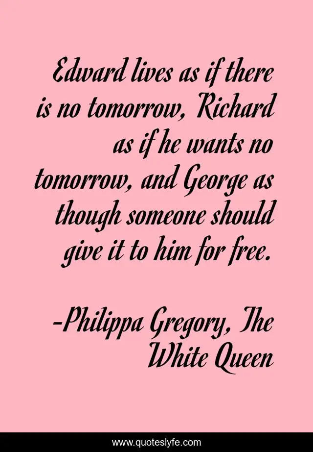 This page presents the quote "Edward lives as if there is no tomorrow, Richard as if he wants no tomorrow, and George as though someone should give it to him for free.". Author of this quote is Philippa Gregory, The White Queen. .