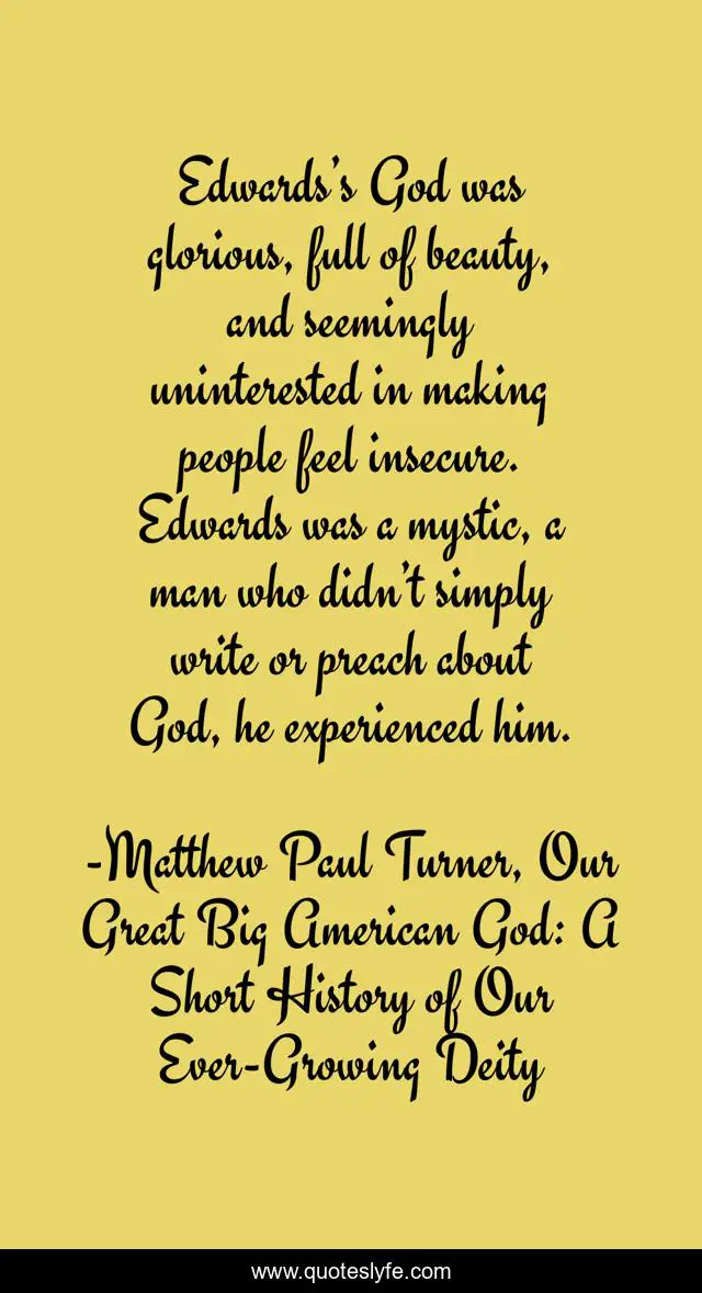 This page presents the quote "Edwards’s God was glorious, full of beauty, and seemingly uninterested in making people feel insecure. Edwards was a mystic, a man who didn’t simply write or preach about God, he experienced him.". Author of this quote is Matthew Paul Turner, Our Great Big American God: A Short History of Our Ever-Growing Deity. This quote is about discipleship, preaching, evangelism,.