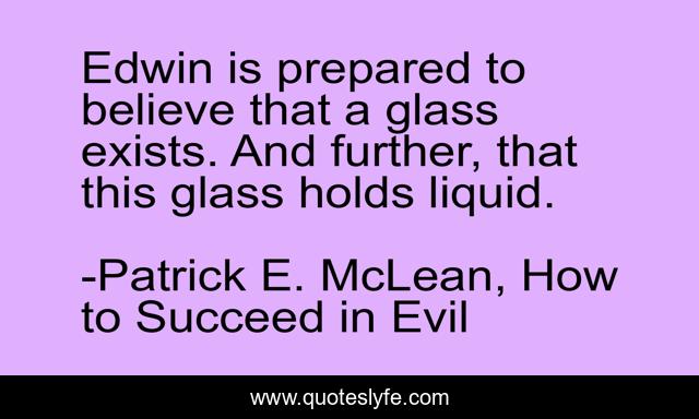 This page presents the quote "Edwin is prepared to believe that a glass exists. And further, that this glass holds liquid.". Author of this quote is Patrick E. McLean, How to Succeed in Evil. This quote is about humor, optimism,.