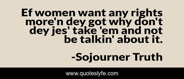 This page presents the quote "Ef women want any rights more'n dey got why don't dey jes' take 'em and not be talkin' about it.". Author of this quote is Sojourner Truth. This quote is about going, getting,.