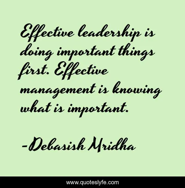 This page presents the quote "Effective leadership is doing important things first. Effective management is knowing what is important.". Author of this quote is Debasish Mridha. This quote is about management, philosophy, debasish-mridha, effective-leadership, debasish-mridha-m-d, quotes, leadership, inspirational, enthusiasm,.