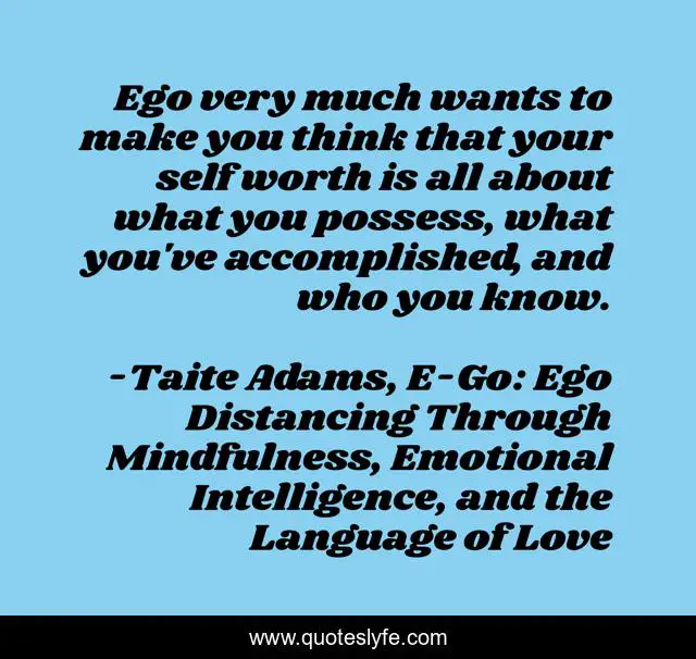 This page presents the quote "Ego very much wants to make you think that your self worth is all about what you possess, what you've accomplished, and who you know.". Author of this quote is Taite Adams, E-Go: Ego Distancing Through Mindfulness, Emotional Intelligence, and the Language of Love. This quote is about ego, egoism, possessions, self-worth,.