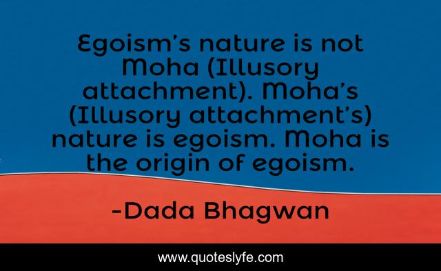 This page presents the quote "Egoism’s nature is not Moha (Illusory attachment). Moha’s (Illusory attachment’s) nature is egoism. Moha is the origin of egoism.". Author of this quote is Dada Bhagwan. This quote is about spiritual, egoistic, egoism, illusory-attachment, moh, ego, attachment, moha,.