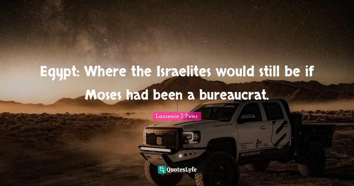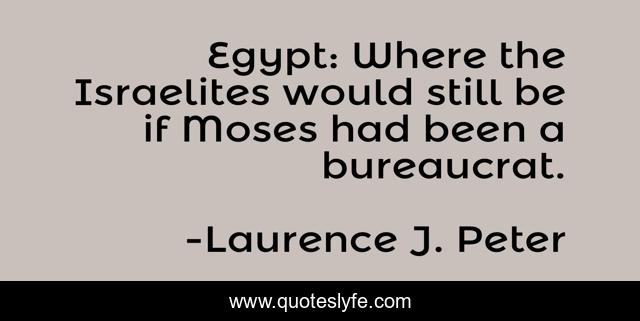 This page presents the quote "Egypt: Where the Israelites would still be if Moses had been a bureaucrat.". Author of this quote is Laurence J. Peter. This quote is about rule, government,.