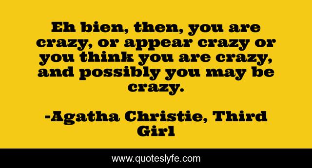This page presents the quote "Eh bien, then, you are crazy, or appear crazy or you think you are crazy, and possibly you may be crazy.". Author of this quote is Agatha Christie, Third Girl. This quote is about third-girl, crazy, hercule-poirot, agatha-christie,.