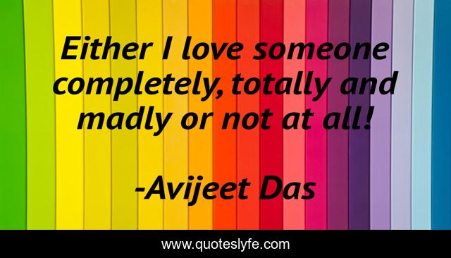 This page presents the quote "Either I love someone completely, totally and madly or not at all!". Author of this quote is Avijeet Das. This quote is about madly-in-love, love, life-and-sayings, writers-on-writing, meaning-of-love, affection,.