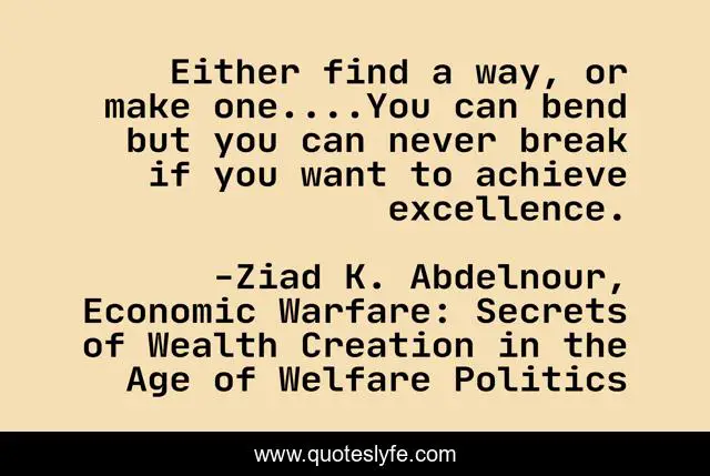 This page presents the quote "Either find a way, or make one....You can bend but you can never break if you want to achieve excellence.". Author of this quote is Ziad K. Abdelnour, Economic Warfare: Secrets of Wealth Creation in the Age of Welfare Politics. .