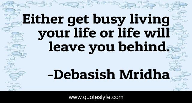 This page presents the quote "Either get busy living your life or life will leave you behind.". Author of this quote is Debasish Mridha. This quote is about living-your-life, live-lessons, philosophy, debasish-mridha, quotes, life-will-leave-you-behind, inspirational, enthusiasm, get-busy-living,.