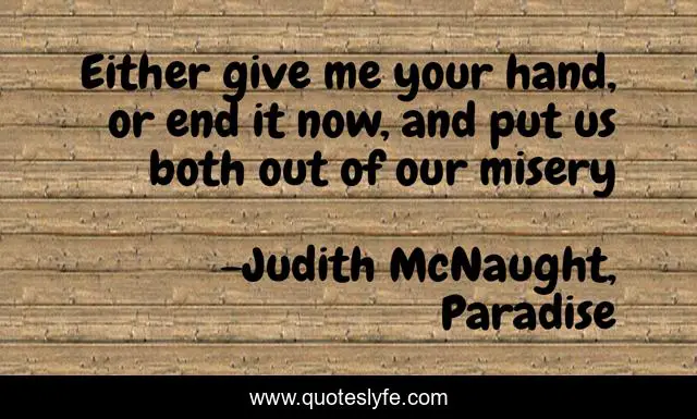 This page presents the quote "Either give me your hand, or end it now, and put us both out of our misery". Author of this quote is Judith McNaught, Paradise. This quote is about breaking-up, heartbreak, love-story,.
