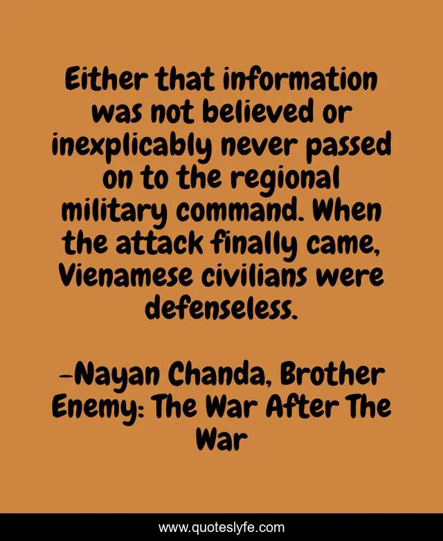 This page presents the quote "Either that information was not believed or inexplicably never passed on to the regional military command. When the attack finally came, Vienamese civilians were defenseless.". Author of this quote is Nayan Chanda, Brother Enemy: The War After The War. This quote is about politics, history, vietnamese,.