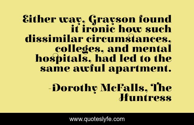 This page presents the quote "Either way, Grayson found it ironic how such dissimilar circumstances, colleges, and mental hospitals, had led to the same awful apartment.". Author of this quote is Dorothy McFalls, The Huntress. .