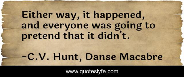 This page presents the quote "Either way, it happened, and everyone was going to pretend that it didn't.". Author of this quote is C.V. Hunt, Danse Macabre. .