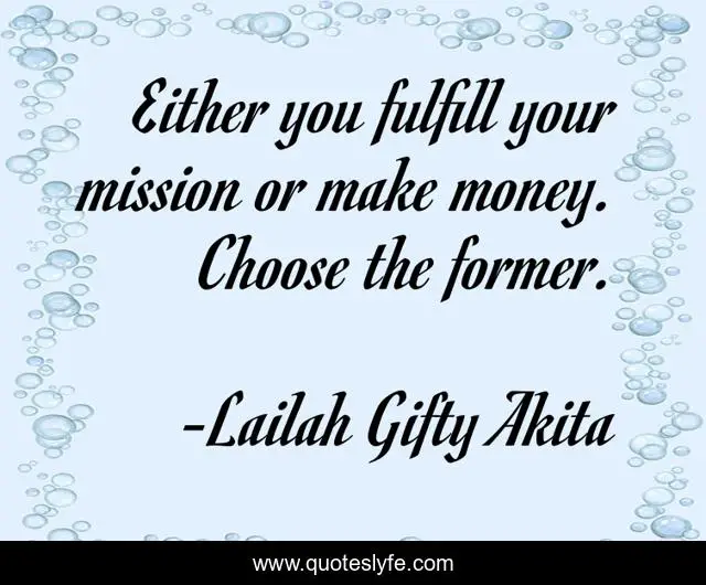 This page presents the quote "Either you fulfill your mission or make money. Choose the former.". Author of this quote is Lailah Gifty Akita. This quote is about decisions, inspiring, passion, mission, wealth,.
