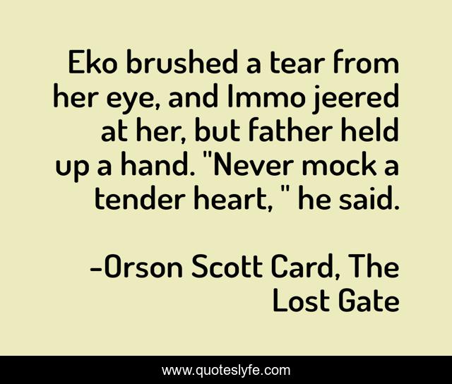 This page presents the quote "Eko brushed a tear from her eye, and Immo jeered at her, but father held up a hand. "Never mock a tender heart, " he said.". Author of this quote is Orson Scott Card, The Lost Gate. This quote is about aphorism, sentiment, mockery,.