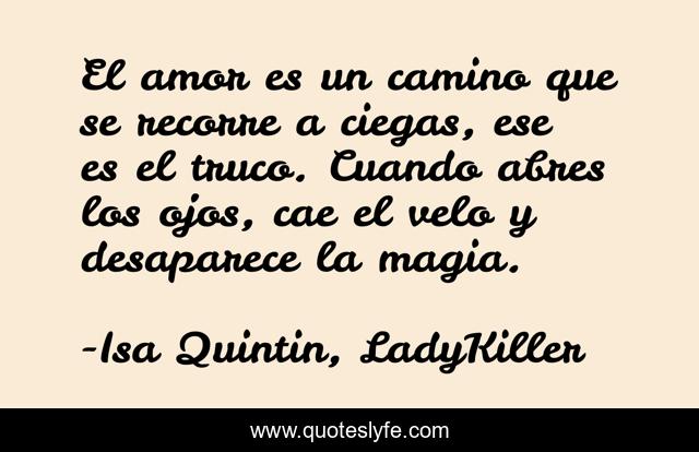 This page presents the quote "El amor es un camino que se recorre a ciegas, ese es el truco. Cuando abres los ojos, cae el velo y desaparece la magia.". Author of this quote is Isa Quintin, LadyKiller. This quote is about love, romantic, quote, ladykiller, romance, love-story, affection,.