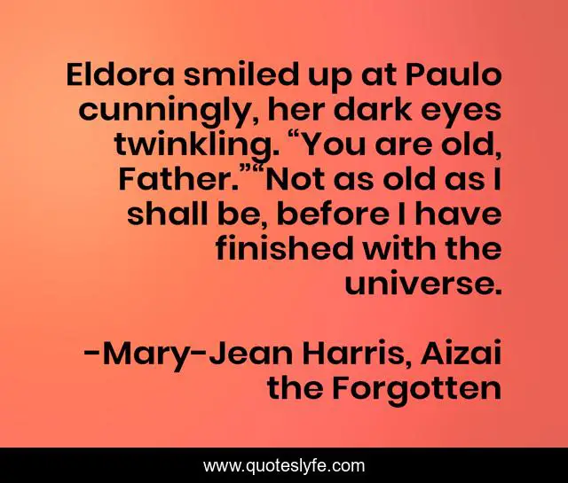 This page presents the quote "Eldora smiled up at Paulo cunningly, her dark eyes twinkling. “You are old, Father.”“Not as old as I shall be, before I have finished with the universe.". Author of this quote is Mary-Jean Harris, Aizai the Forgotten. This quote is about father-daughter, universe, philosopher, paulo, old-age, eldora, perseverence,.