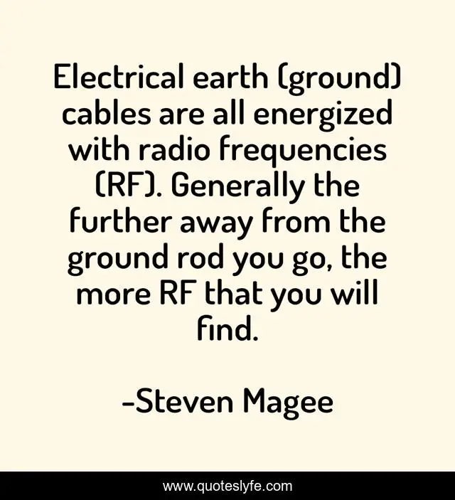 This page presents the quote "Electrical earth (ground) cables are all energized with radio frequencies (RF). Generally the further away from the ground rod you go, the more RF that you will find.". Author of this quote is Steven Magee. This quote is about rod, frequency, radio, further, go, earth, cables, find, ground,.