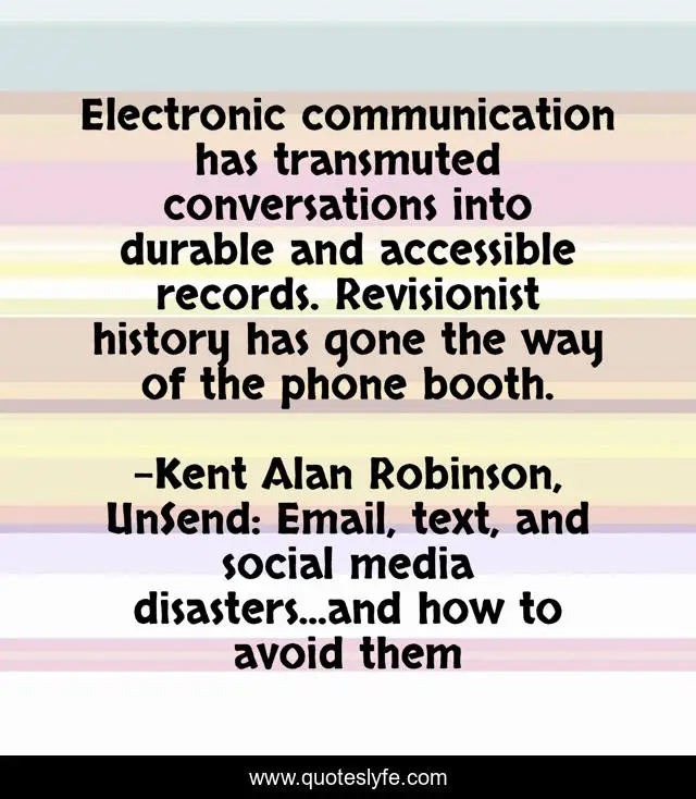 "Kent Alan Robinson, UnSend: Email, text, and social media disasters...and how to avoid them Quotes." Quoteslyfe.com, 2025. Fri. 05 Dec. 2025. <https://www.quoteslyfe.com/quote/Electronic-communication-has-transmuted-conversations-into-durable-77824>.