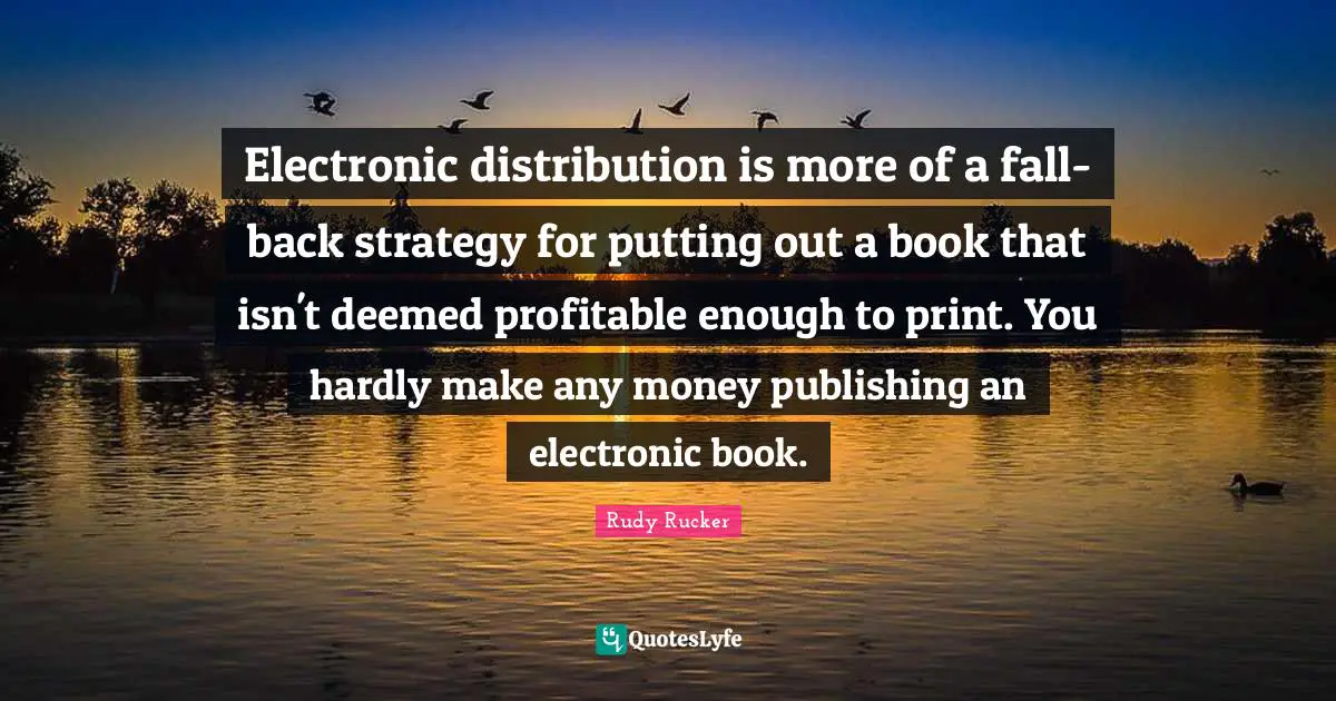 This page presents the quote "Electronic distribution is more of a fall-back strategy for putting out a book that isn't deemed profitable enough to print. You hardly make any money publishing an electronic book.". Author of this quote is Rudy Rucker. This quote is about money, print, strategy, fall, publishing, enough, distribution, rude, book,.