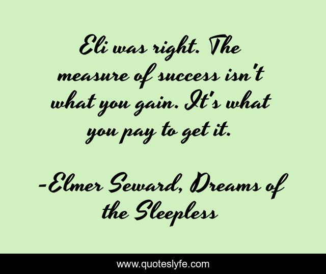 This page presents the quote "Eli was right. The measure of success isn't what you gain. It's what you pay to get it.". Author of this quote is Elmer Seward, Dreams of the Sleepless. This quote is about loss, success,.