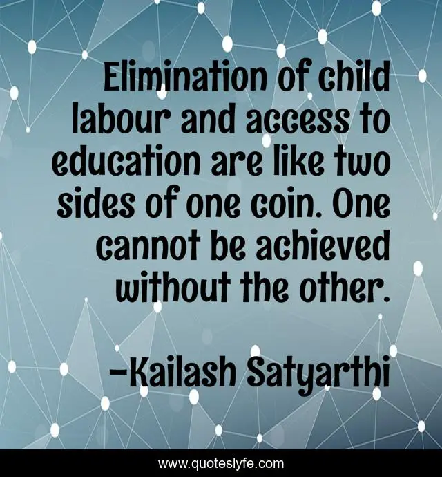 This page presents the quote "Elimination of child labour and access to education are like two sides of one coin. One cannot be achieved without the other.". Author of this quote is Kailash Satyarthi. This quote is about without, two, child,.