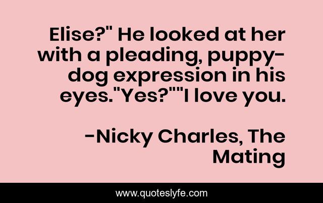 This page presents the quote "Elise?" He looked at her with a pleading, puppy-dog expression in his eyes."Yes?""I love you.". Author of this quote is Nicky Charles, The Mating. This quote is about love, sweet, the-mating, law-of-the-lycans, i-love-you, elise, nicky-charles, affection,.