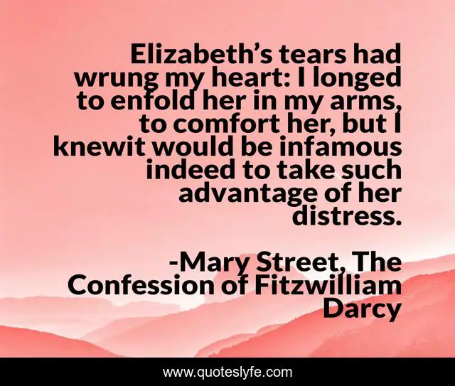 This page presents the quote "Elizabeth’s tears had wrung my heart: I longed to enfold her in my arms, to comfort her, but I knewit would be infamous indeed to take such advantage of her distress.". Author of this quote is Mary Street, The Confession of Fitzwilliam Darcy. This quote is about mr-darcy, love, distress, comfort, arms, elizabeth-bennet, tears, affection,.