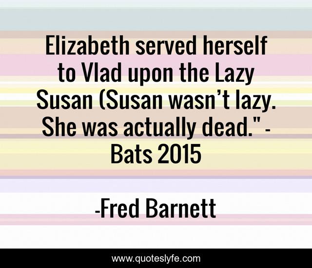 This page presents the quote "Elizabeth served herself to Vlad upon the Lazy Susan (Susan wasn’t lazy. She was actually dead." — Bats 2015". Author of this quote is Fred Barnett. This quote is about bats, vampires,.