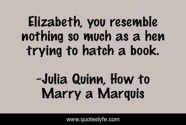 This page presents the quote "Elizabeth, you resemble nothing so much as a hen trying to hatch a book.". Author of this quote is Julia Quinn, How to Marry a Marquis. This quote is about hen, book, elizabeth,.