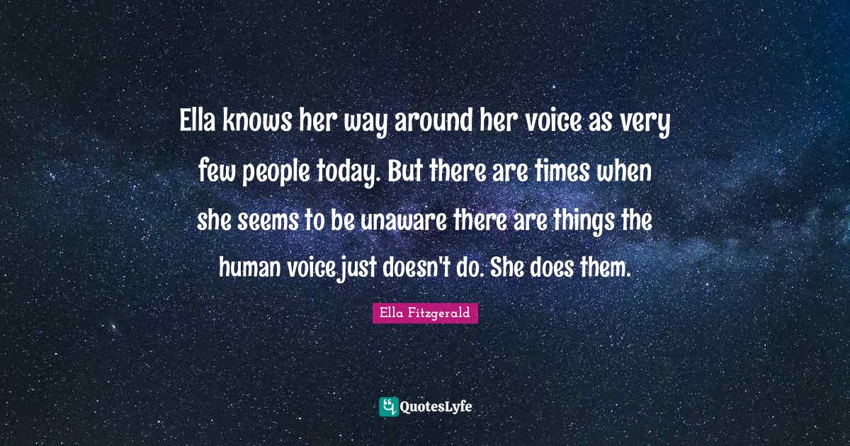 This page presents the quote "Ella knows her way around her voice as very few people today. But there are times when she seems to be unaware there are things the human voice just doesn't do. She does them.". Author of this quote is Ella Fitzgerald. This quote is about today, voice, way, seems, people, knows, doe,.