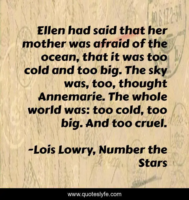 This page presents the quote "Ellen had said that her mother was afraid of the ocean, that it was too cold and too big. The sky was, too, thought Annemarie. The whole world was: too cold, too big. And too cruel.". Author of this quote is Lois Lowry, Number the Stars. This quote is about world, cold, sky, cruel,.