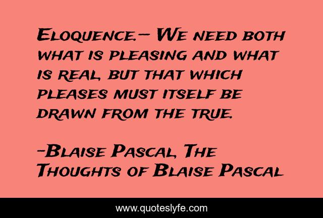 This page presents the quote "Eloquence.— We need both what is pleasing and what is real, but that which pleases must itself be drawn from the true.". Author of this quote is Blaise Pascal, The Thoughts of Blaise Pascal. This quote is about real, selection, eloquence, truth, need, pleasing, true,.