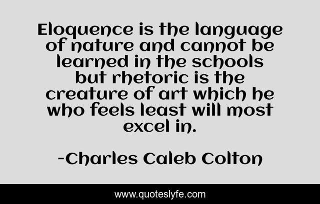 This page presents the quote "Eloquence is the language of nature and cannot be learned in the schools but rhetoric is the creature of art which he who feels least will most excel in.". Author of this quote is Charles Caleb Colton. This quote is about words, language,.