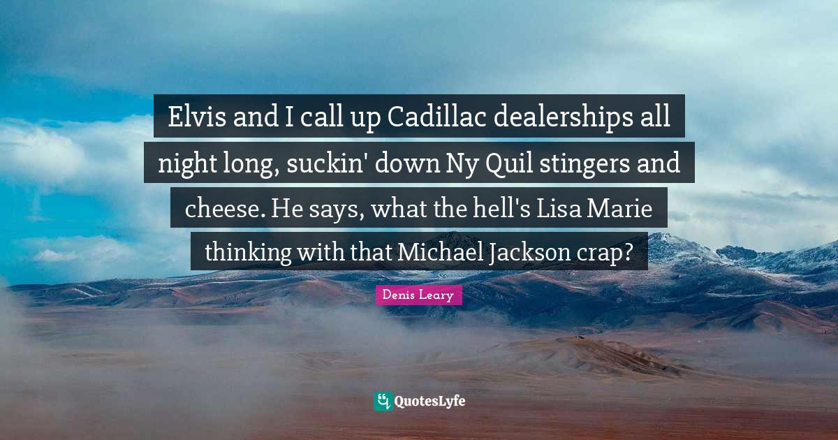 This page presents the quote "Elvis and I call up Cadillac dealerships all night long, suckin' down Ny Quil stingers and cheese. He says, what the hell's Lisa Marie thinking with that Michael Jackson crap?". Author of this quote is Denis Leary. This quote is about marie, long, all night, crap, hell, thinking, night, cheese,.