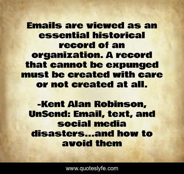 This page presents the quote "Emails are viewed as an essential historical record of an organization. A record that cannot be expunged must be created with care or not created at all.". Author of this quote is Kent Alan Robinson, UnSend: Email, text, and social media disasters...and how to avoid them. This quote is about management, business, self-help-book, human-resources, management-and-leadership, self-help,.