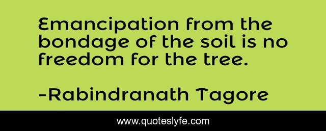 This page presents the quote "Emancipation from the bondage of the soil is no freedom for the tree.". Author of this quote is Rabindranath Tagore. This quote is about soil, tree, bondage,.