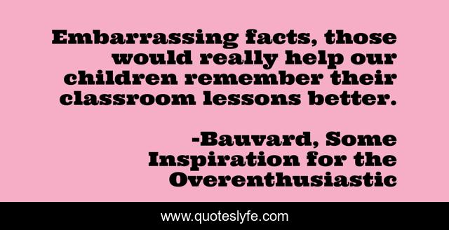 This page presents the quote "Embarrassing facts, those would really help our children remember their classroom lessons better.". Author of this quote is Bauvard, Some Inspiration for the Overenthusiastic. This quote is about funny, education, humor, comedy, shame,.