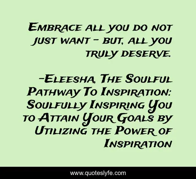 This page presents the quote "Embrace all you do not just want - but, all you truly deserve.". Author of this quote is Eleesha, The Soulful Pathway To Inspiration: Soulfully Inspiring You to Attain Your Goals by Utilizing the Power of Inspiration. This quote is about empowerment, positive, motivational, soul, quotes, channeling, inspirational, affirmations, enthusiasm,.