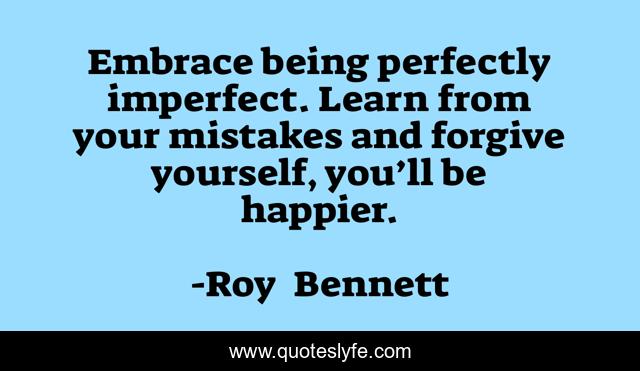This page presents the quote "Embrace being perfectly imperfect. Learn from your mistakes and forgive yourself, you’ll be happier.". Author of this quote is Roy Bennett. This quote is about confidence, flaws, life-lessons, inspirational, life, perfectionism, forgive, mistakes, authentic-self,.