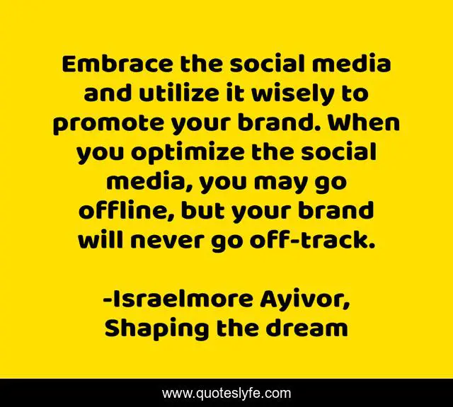 This page presents the quote "Embrace the social media and utilize it wisely to promote your brand. When you optimize the social media, you may go offline, but your brand will never go off-track.". Author of this quote is Israelmore Ayivor, Shaping the dream. This quote is about website, food-for-thought, promote, wise, israelmore-ayivor, personal-branding, twitter, skype, off-track,.