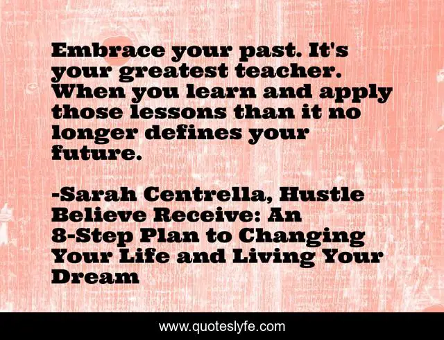 This page presents the quote "Embrace your past. It's your greatest teacher. When you learn and apply those lessons than it no longer defines your future.". Author of this quote is Sarah Centrella, Hustle Believe Receive: An 8-Step Plan to Changing Your Life and Living Your Dream. This quote is about life-coaching, self-help, quotes, quotes-about-life, personal-development, life-coaching-advice,.