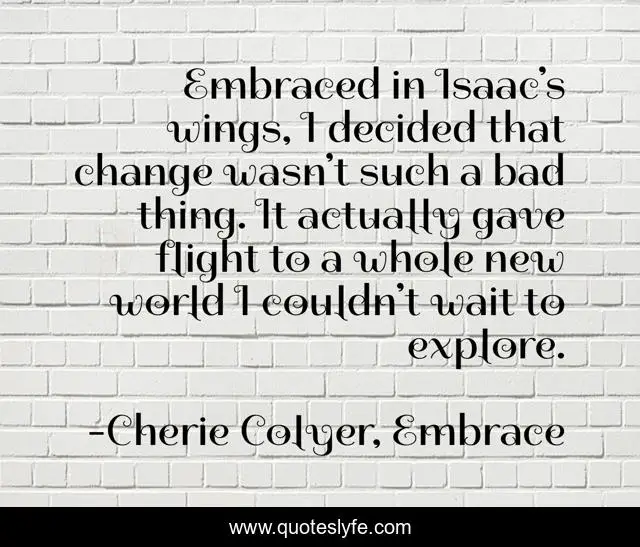 This page presents the quote "Embraced in Isaac’s wings, I decided that change wasn’t such a bad thing. It actually gave flight to a whole new world I couldn’t wait to explore.". Author of this quote is Cherie Colyer, Embrace. This quote is about thing, new-world, change, inspirational, enthusiasm,.