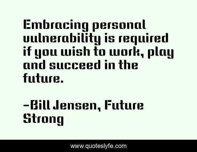This page presents the quote "Embracing personal vulnerability is required if you wish to work, play and succeed in the future.". Author of this quote is Bill Jensen, Future Strong. This quote is about enthusiasm, future, leadership, inspirational, self-help,.