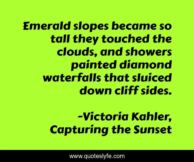 This page presents the quote "Emerald slopes became so tall they touched the clouds, and showers painted diamond waterfalls that sluiced down cliff sides.". Author of this quote is Victoria Kahler, Capturing the Sunset. This quote is about mountains, rain, waterfalls,.